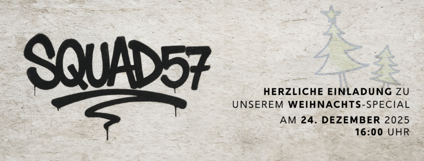 Dieses Jahr laden wir euch zu unserem Heilig-Abend-Gottesdienst unter dem Motto „Squad57“ ein – eine fiktive TV-Serie, in der die 57 ganz einfach für unsere Heimat-Postleitzahl steht.